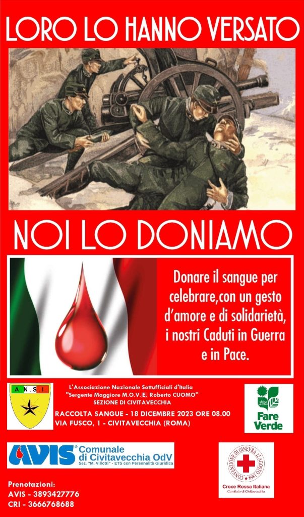 Si è svolta oggi, 18 dicembre 2023 a Civitavecchia, la manifestazione nazionale denominata “Loro lo hanno versato, Noi lo doniamo”, la quale intende onorare la memoria dei nostri militari che in guerra e in pace hanno sacrificato la loro vita per la Comunità Nazionale. . L’evento promosso in tutta Italia dall’Associazione Nazionale Sottufficiali d’Italia e organizzato dalla locale sezione “Sergente Maggiore M.O.V.E. Roberto CUOMO in collaborazione con l’AVIS Comunale di Civitavecchia OdV-Sezione “Mario Villotti” ETS con personalità giuridica e con la Croce Rossa Italiana Comitato di Civitavecchia, ha permesso la raccolta di un cospicuo numero di sacche di sangue, di cui cinque donate da militari dell’Esercito in servizio.