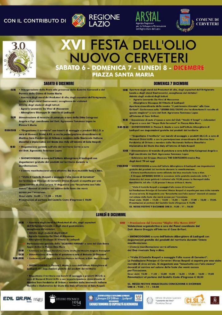 “Avremo due momenti d’eccezione dedicati ai motori, da sempre amici della Festa dell’Olio Nuovo di Cerveteri – ha aggiunto Riccardo Ferri – domenica 7 dicembre, a partire dalle ore 10:30 verranno a trovarci le auto d’epoca del Club ‘Vecchi 4 Tempi’ e i ciclomotori del ‘Vespa Club Cerveteri’, mentre lunedì 8 dicembre arrivano le ‘magiche rosse’, delle ‘Scuderie Ferrari’ del Club Roma Appia Antica. Spazio anche alla musica, con la consueta e speciale partecipazione, sempre lunedì 8 dicembre, del Gruppo Bandistico Cerite. Vi aspettiamo a Cerveteri per tre giorni di festa davvero imperdibili”.