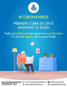 Anche a Cerveteri prende il via la campagna ‘Prenditi cura di chi è anziano e solo’. Si tratta di un’iniziativa speciale volta a coloro che in questo periodo difficile, di quarantena, si vedono costretti a rimanere a casa, lontano dai propri affetti.