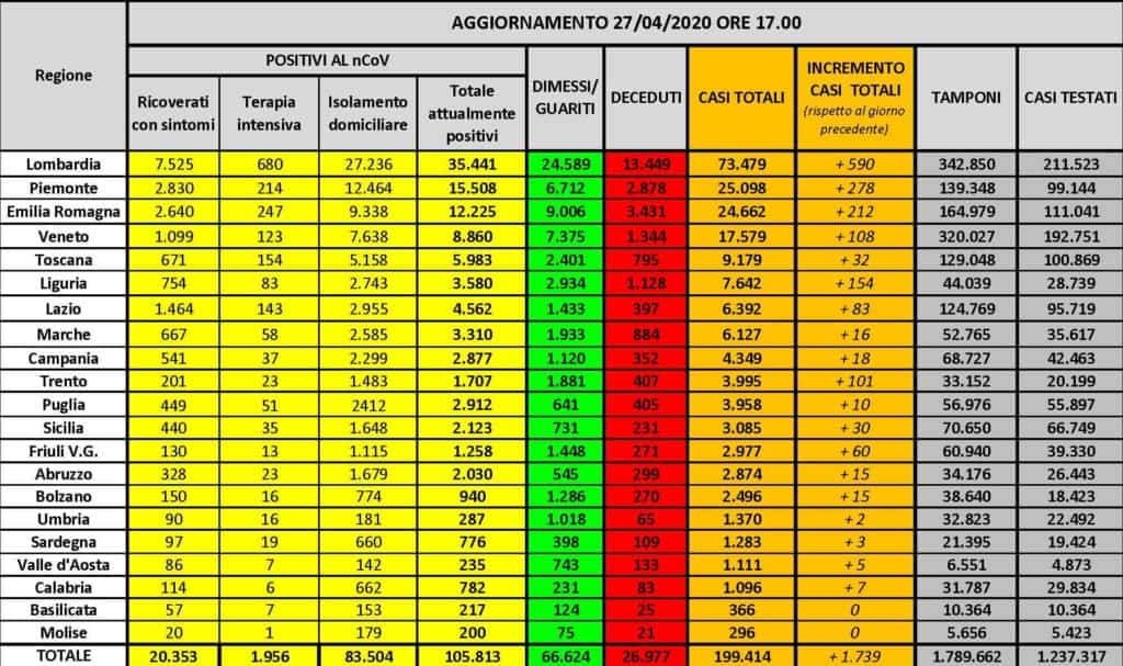In particolare, nell’ambito del monitoraggio sanitario relativo alla diffusione del Coronavirus sul nostro territorio, a oggi, 27 aprile, il totale delle persone che hanno contratto il virus è 199.414, con un incremento rispetto a ieri di 1.739 nuovi casi. Il numero totale di attualmente positivi è di 105.813, con una decrescita di 290 assistiti rispetto a ieri.