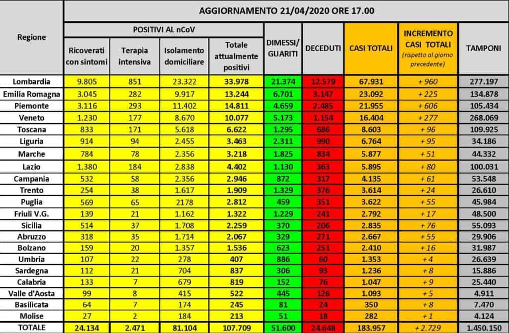 Coronavirus, calano nettamente i malati. 534 le persone decedute – Continua l’impegno del Dipartimento nelle attività di coordinamento di tutte le componenti e strutture operative del Servizio Nazionale della protezione civile. In particolare, nell’ambito del monitoraggio sanitario relativo alla diffusione del Coronavirus sul nostro territorio, a oggi, 21 aprile, il totale delle persone che hanno contratto il virus è 183.957, con un incremento rispetto a ieri di 2.729 nuovi casi. Il numero totale di attualmente positivi è di 107.709, con un decremento di 528 assistiti rispetto a ieri. Tra gli attualmente positivi 2.471 sono in cura presso le terapie intensive, con una decrescita di 102 pazienti rispetto a ieri. 24.134 persone sono ricoverate con sintomi, con un decremento di 772 pazienti rispetto a ieri. 81.104 persone, pari al 75% degli attualmente positivi, sono in isolamento senza sintomi o con sintomi lievi. Rispetto a ieri i deceduti sono 534 e portano il totale a 24.648. Il numero complessivo dei dimessi e guariti sale invece a 51.600, con un incremento di 2.723 persone rispetto a ieri. Nel dettaglio, i casi attualmente positivi sono 33.978 in Lombardia, 13.244 in Emilia-Romagna, 14.811 in Piemonte, 10.077 in Veneto, 6.622 in Toscana, 3.463 in Liguria, 3.218 nelle Marche, 4.402 nel Lazio, 2.946 in Campania, 1.909 nella Provincia autonoma di Trento, 2.812 in Puglia, 1.322 in Friuli Venezia Giulia, 2.259 in Sicilia, 2.067 in Abruzzo, 1.536 nella Provincia autonoma di Bolzano, 407 in Umbria, 837 in Sardegna, 819 in Calabria, 522 in Valle d’Aosta, 245 in Basilicata e 213 in Molise.