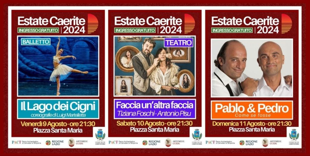 Prosegue il calendario di eventi culturali 𝗱𝗲𝗹𝗹’𝗘𝘀𝘁𝗮𝘁𝗲 𝗖𝗮𝗲𝗿𝗶𝘁𝗲 𝟮𝟬𝟮𝟰 a 𝗖𝗲𝗿𝘃𝗲𝘁𝗲𝗿𝗶. Dopo il successo del Concerto del Gruppo Bandistico Cerite e del teatro con l’omaggio a Luigi Pirandello, nel prossimo weekend spazio alla 𝗱𝗮𝗻𝘇𝗮, 𝗮𝗹 𝘁𝗲𝗮𝘁𝗿𝗼 𝗲 𝗮𝗹𝗹𝗮 𝗰𝗼𝗺𝗶𝗰𝗶𝘁𝗮̀!
