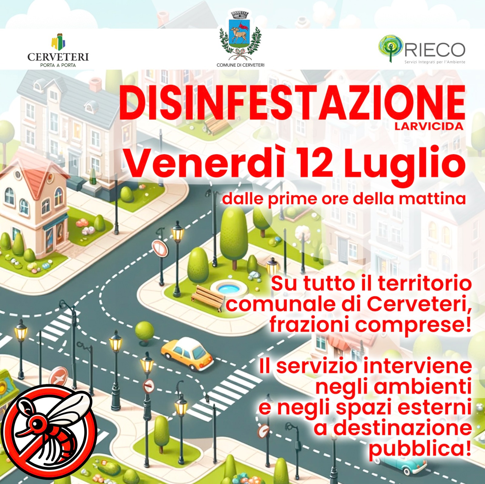 Si comunica che venerdì 12 luglio, dalle prime ore della mattina, verrà eseguita un’operazione di disinfestazione larvicida su tutto il territorio, comprese le frazioni.