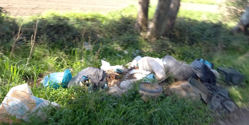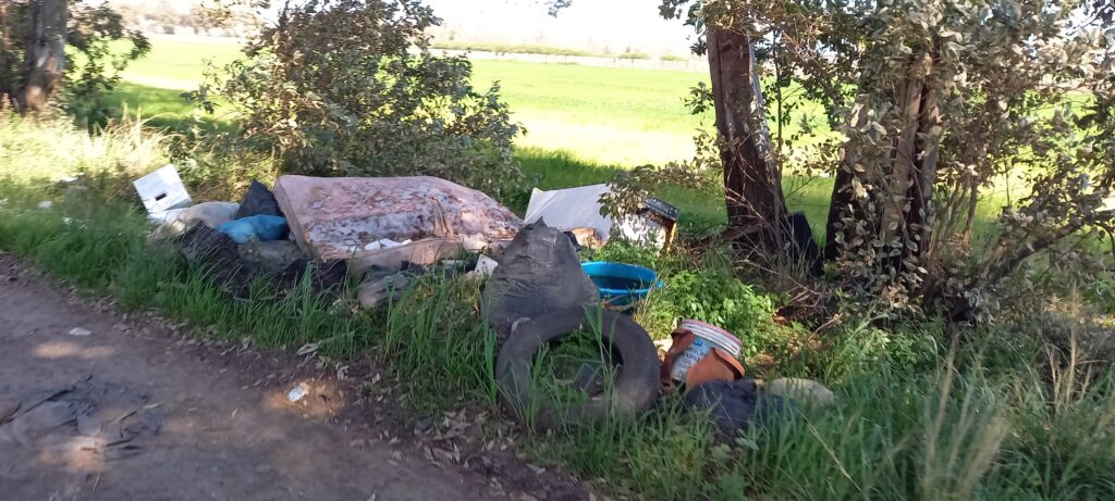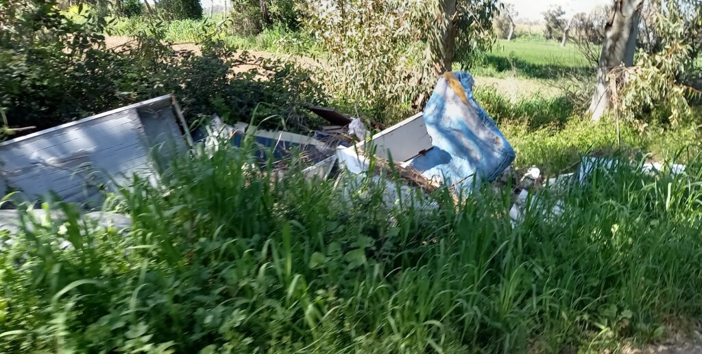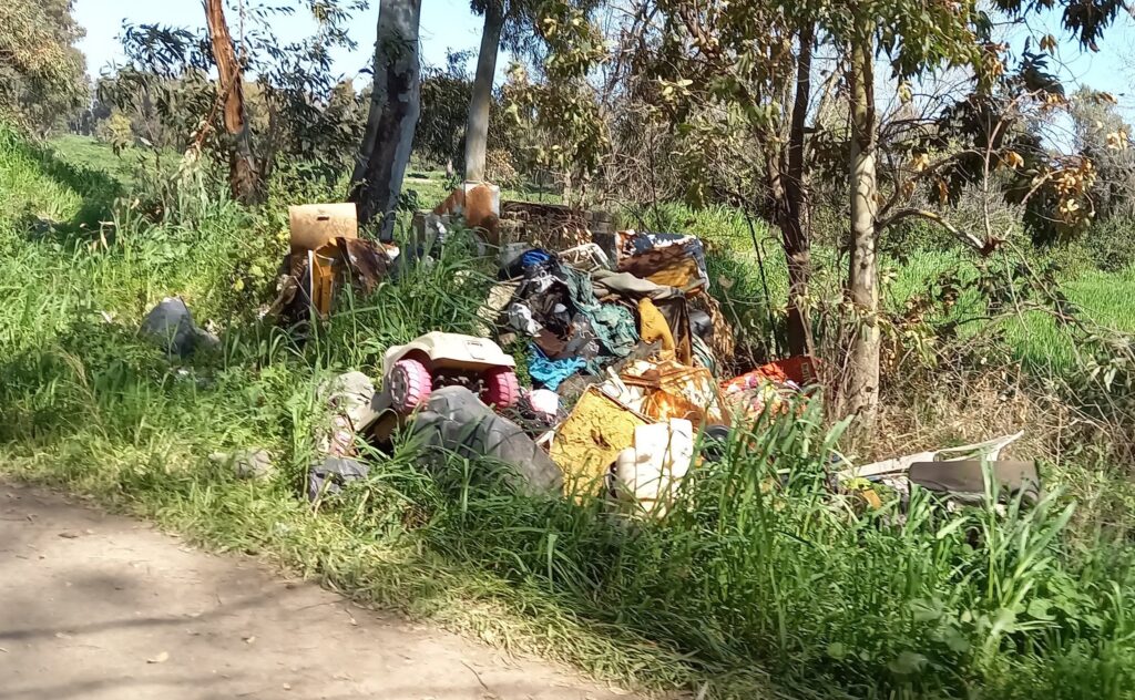 La denuncia arriva da un cittadino. La discarica si trova proprio a ridosso degli argini dove scorrono i canali con l’acqua per innaffiare le piantagioni dei campi.