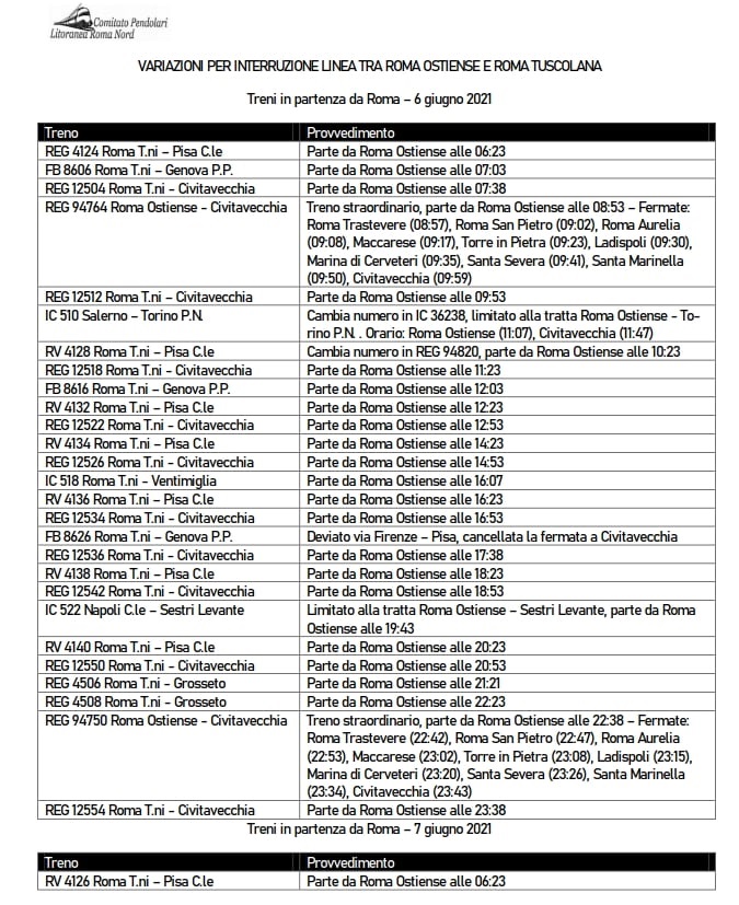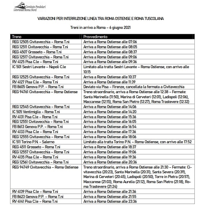 I lavori causeranno inoltre una singola variazione nella giornata del 7 giugno che riguarderà il treno 4126 Roma – Pisa.