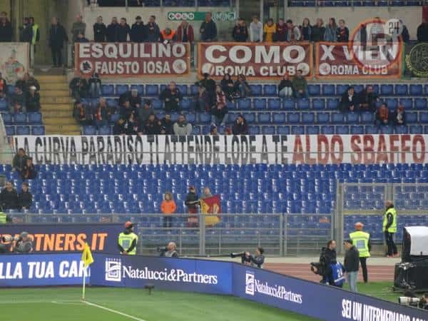 Ieri sera durante la partita con la Fiorentina i tifosi giallorossi hanno ricordato con uno striscione Aldo Sbaffo ex presidente A.I.R.C. e grande tifoso della Roma. Aldo ex assessore di Santa Marinella e proprietario dello Sporting Club nella cittadina del litorale si è spento dopo una lunga malattia.