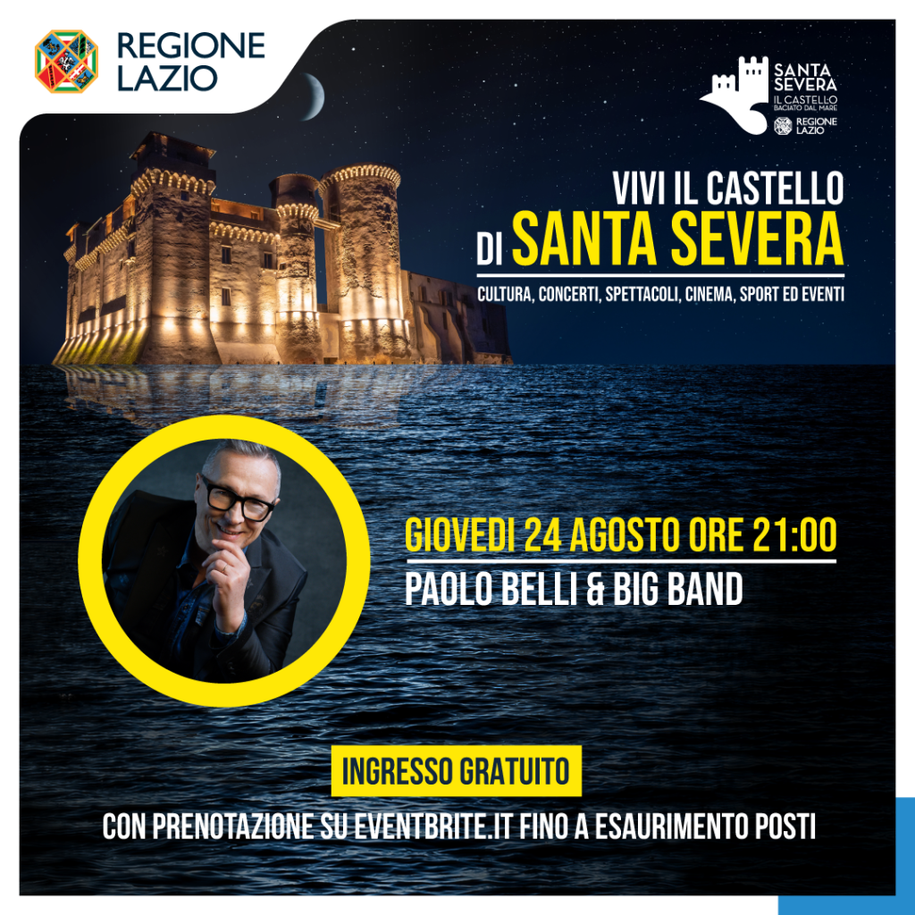 Paolo Belli e la sua Big Band arriva al Castello di Santa Severa con un concerto previsto per giovedì 24 agosto alle 21.00 che si inserisce nel cartellone degli eventi in programma per “Vivi il Castello di Santa Severa“, rassegna promossa dalla Regione Lazio, Assessorato alla Cultura e organizzata dalla società in house LAZIOcrea in collaborazione con ATCL – Circuito Multidisciplinare del Lazio.