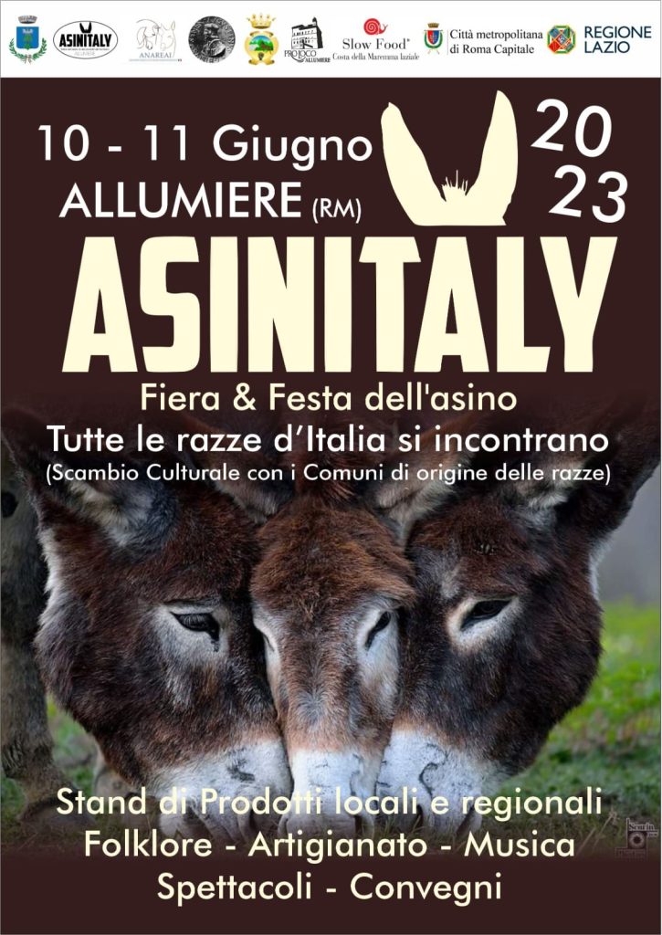 Il 10 e 11 giugno ad Allumiere si svolgerà ‘ASINITALY 2023’, Fiera e Festa dell’asino, un evento di carattere nazionale che si snoderà per le vie del paese e che coinvolgerà produttori, commercianti e tante associazioni di Allumiere. Sará l’occasione per appassionati, visitatori e famiglie di vedere e conoscere tutte le razze asinine riconosciute in Italia, degustare prodotti di latte d’asina , seguire convegni sulla salvaguardia delle razze e onoterapia ,esibizioni di maniscalchi. Non solo, sarà una due giorni di vera e propria festa con stand gastronomici di prodotti locali e regionali, artigianato, musica e folklore.