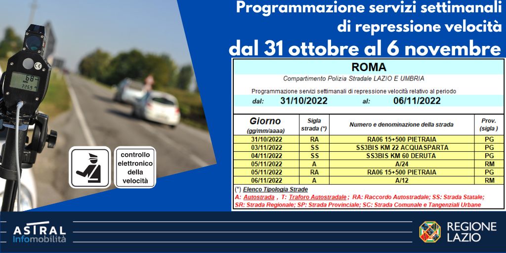 Il controllo è effettuato all’interno di una programmazione settimanale, dal 31 ottobre al 6 novembre, che vedrà interessante molte strade: