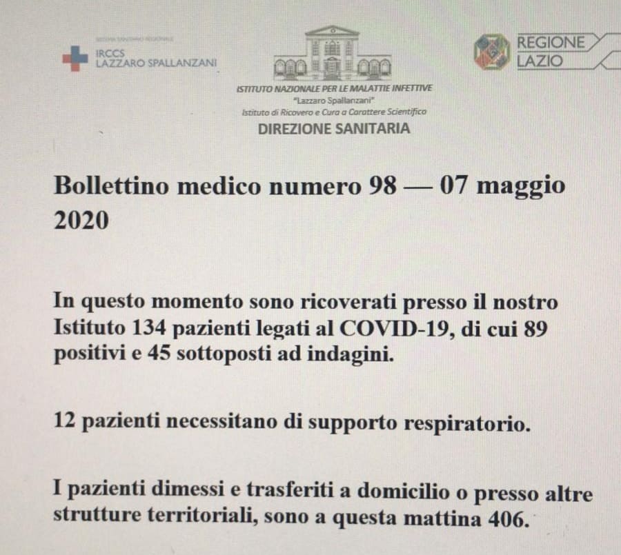 FacebookTweetLikeEmail Sono 145 i pazienti attualmente ricoverati Il bollettino di oggi dello Spallanzani FacebookTweetLikeEmail Share: