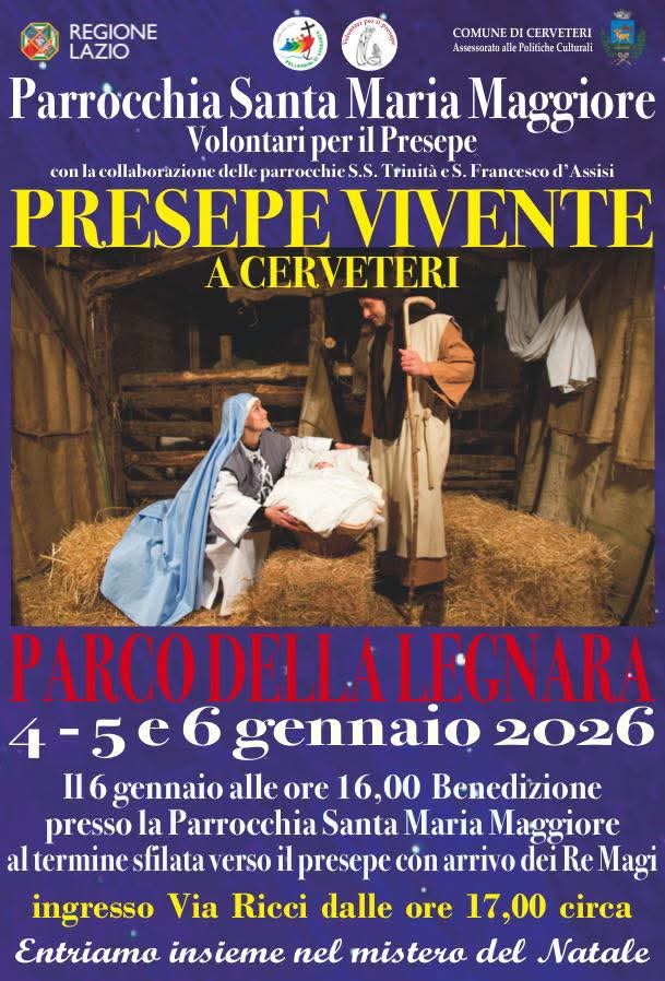 La Parrocchia Santa Maria Maggiore, in collaborazione con le parrocchie S.S. Trinità e S. Francesco d’Assisi e il gruppo Volontari per il Presepe, invita la cittadinanza a partecipare alla nuova edizione del Presepe Vivente a Cerveteri. L’evento, patrocinato dalla Regione Lazio e dal Comune di Cerveteri, si terrà presso il suggestivo scenario del Parco della Legnara.