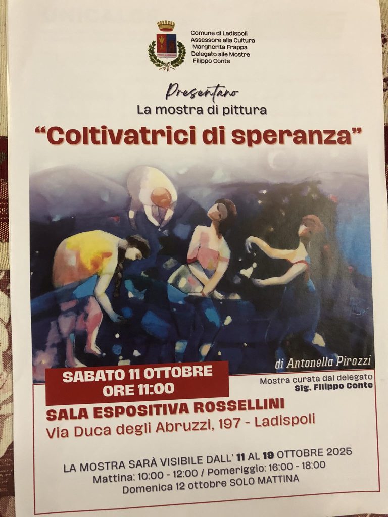 Ladispoli – Un sabato mattina all’insegna dell’arte e della creatività ha accolto cittadini e appassionati alla Sala Rossellini, dove è stata inaugurata la mostra personale dell’artista Antonella Pirozzi. L’evento, svoltosi sabato 11 ottobre alle ore 11:30, ha visto la partecipazione di un pubblico numeroso e curioso di ammirare le oltre 40 opere esposte.