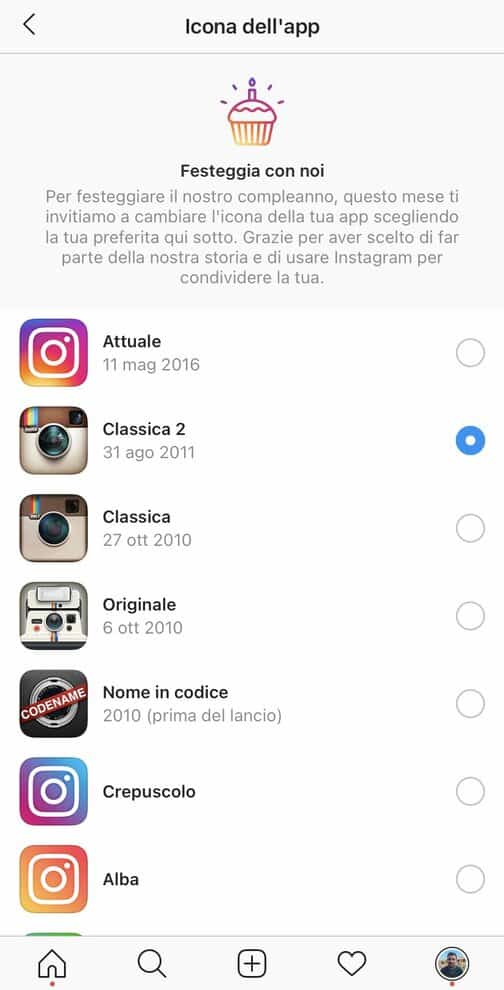 «Per festeggiare il nostro compleanno questo mese ti invitiamo a cambiare l’icona della tua app scegliendo la tua preferita qui sotto». È questo il messaggio che gli utenti si trovano davanti se spulciano per bene all’interno di Instagram quest’oggi. Sì, perché il 6 ottobre la popolarissima app della galassia Facebook, per i suoi primi dieci anni di attività, ha deciso di “regalare” agli utenti la possibilità di modificare l’icona che ormai da alcuni anni tiene compagnia ai milioni di utenti del social di Mark Zuckerberg.
