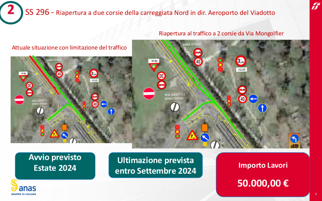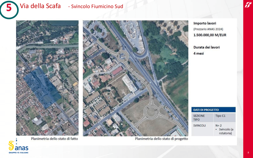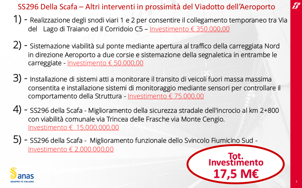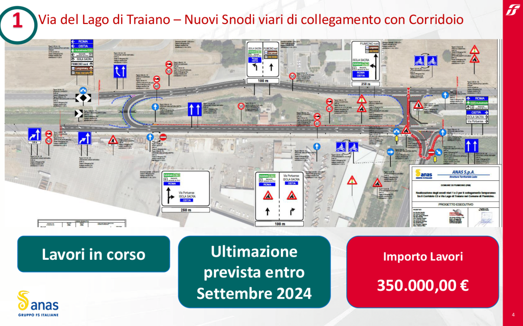 Realizzazione degli Snodi Viari 1 e 2 Il Comune di Fiumicino ha richiesto la realizzazione degli snodi viari 1 e 2 per consentire il collegamento temporaneo tra Via del Lago di Traiano e il Corridoio C5. Questo intervento, con un costo stimato di circa 350.000,00 euro, mira a migliorare la fruibilità della viabilità alternativa necessaria durante la demolizione del Viadotto. Anas ha redatto il progetto esecutivo, approvato dal Comune nel mese di aprile. L’affidamento dei lavori è in corso, con inizio previsto nelle prossime settimane.