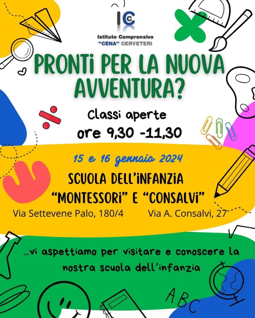 Lunedì 15 gennaio e martedì 16 gennaio, l’Istituto Comprensivo Giovanni Cena di Cerveteri aprirà le sue classi a genitori e bambini, dalle 9:30 alle 11:30. Si potranno visitare la Scuola dell’Infanzia “Montessori”, in Via Settevene Palo 180/4 e la Scuola dell’Infanzia “Consalvi”, in Via A. Consalvi, 27.