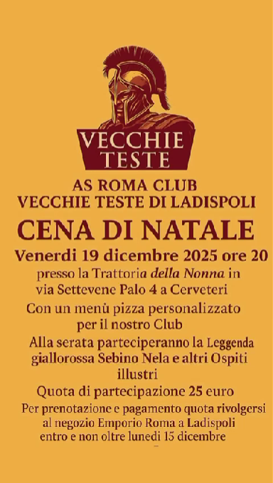 L’AS Roma Club Vecchie Teste di Ladispoli è pronto a celebrare il Natale con una serata all’insegna della passione giallorossa e della convivialità. L’appuntamento è fissato per venerdì 19 dicembre 2025, alle ore 20, presso la Trattoria della Nonna, in via Settevene Palo 4 a Cerveteri.