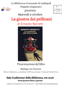L’amministrazione comunale informa che presso la biblioteca di Ladispoli martedì 8 ottobre alle ore 16:30 si svolgerà la presentazione del libro La giostra dei Pellicani di Ernesto Berretti.