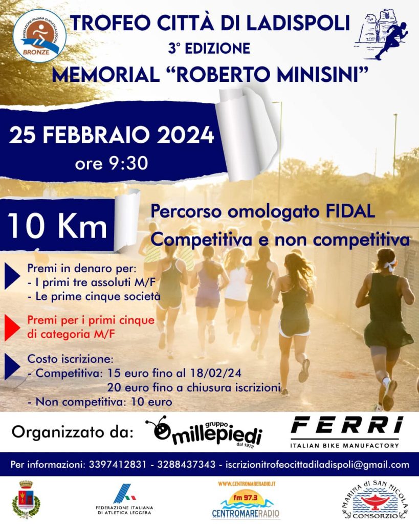 E’ in arrivo la terza edizione del Trofeo Città di Ladispoli che anche quest’anno viene dedicata al ricordo di Roberto Minisini. Il 24 febbraio, a partire dalle ore 9:30, gli appassionati avranno la possibilità di correre una 10 km su un percorso omologato Fidal. Nella giornata si terranno sia la versione competitiva che quella non competitiva della corsa. Per i vincitori sono previsti dei premi in denaro.