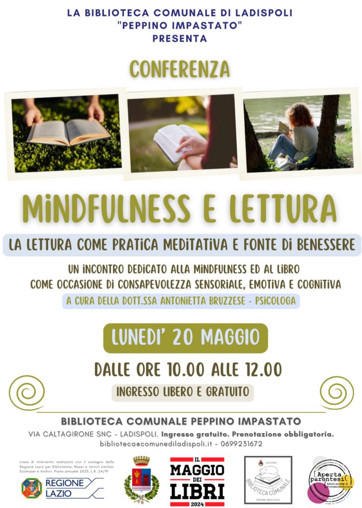 Lunedì 20 maggio alle ore 10:00 conferenza “MINDFULNESS E LETTURA: la lettura come pratica meditativa e fonte di benessere“: incontro dedicato alla minfulness ed al libro come occasione di consapevolezza sensoriale, emotiva e cognitiva.