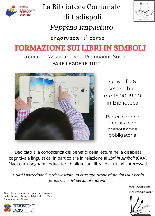 Si tratta di un corso di formazione sui libri scritti nei simboli della Comunicazione Aumentativa Alternativa (CAA), rivolto ad insegnanti, educatori, bibliotecari, librai e a tutti coloro interessati a conoscere questi testi, che hanno un utilizzo inclusivo e sempre più esteso in ambito educativo e sociale.