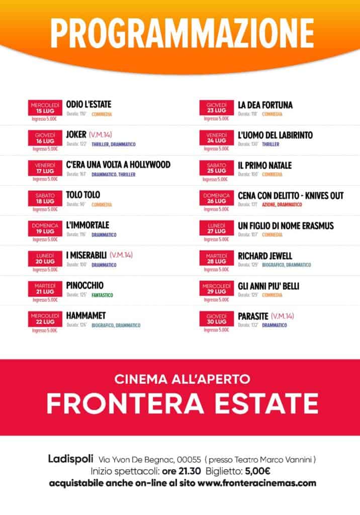 Ladispoli, dal 15 luglio cinema sotto le stelle – “L’estate ladispolana – ha commentato l’assessore alla cultura e spettacolo, Marco Milani – quindi si arricchisce di un appuntamento, che si protrarrà sino a settembre, ormai tradizionale, in attesa della grande riapertura dell’Auditorium Freccia entro la fine dell’anno. Ad agosto sarà protagonista il Caravaggio con due imperdibili mostre che vedranno come ospite d’onore il Maestro Guido Venanzoni, attualmente ospite di Vittorio Sgarbi a Sutri con una mostra delle sue opere. La Grottaccia è quasi sold out per tutti gli spettacoli previsti in cartellone, mentre la Mostra Mercato Artigianale di “Nuova Luce” sta riscuotendo successo e consensi ovunque. Market on the street allieta i week end su Viale Italia, tra colori e profumi tipicamente ladispolani. L’estate perfetta per lasciarsi alle spalle il brutto periodo appena trascorso”.