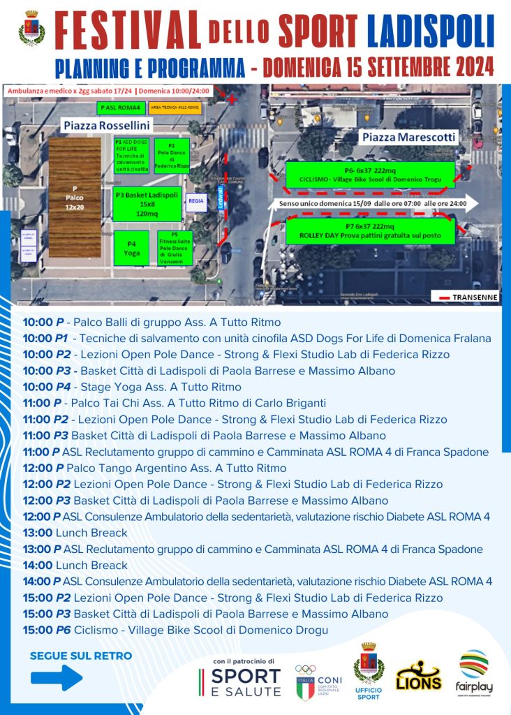 Sabato 14 e domenica 15 settembre due giorni interamente dedicati allo sport, tra viale Italia, Piazza Rossellini e Piazza Marescotti, con il “Festival dello Sport di Ladispoli”, patrocinato dal Comune di Ladispoli, Coni Lazio e organizzato dalla ASD Lions.