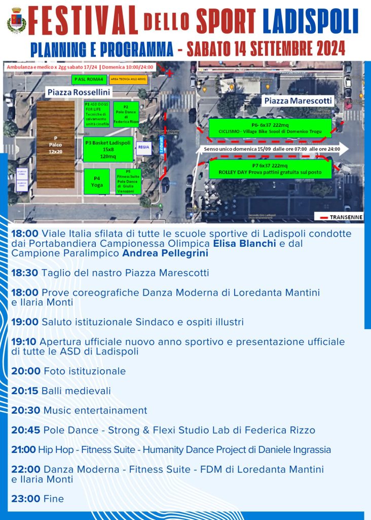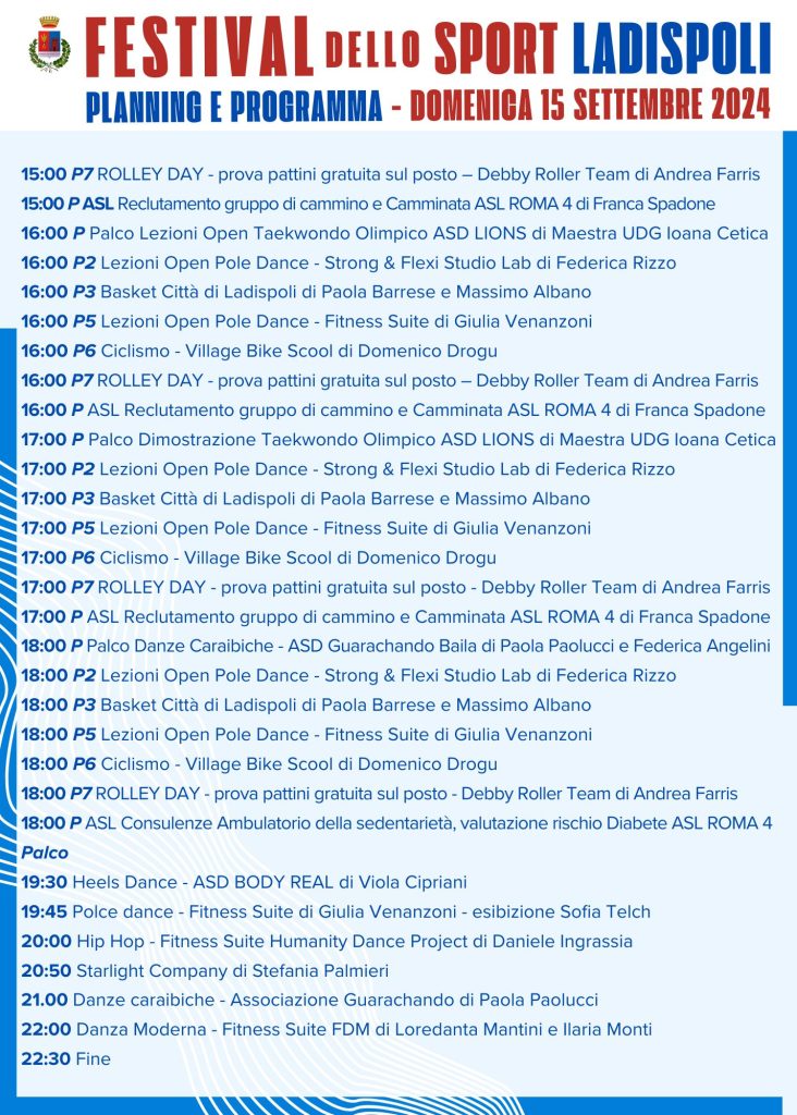 Il “Festival dello sport di Ladispoli” proseguirà poi domenica 15 settembre dalle ore 10:00 con nove ore di attività sportive. Ogni ASD potrà prenotare una delle 12 aree predisposte quali: 11 aree di terra (60mq l’una) più l’area palco. Le aree saranno assegnate in ordine cronologico di ricezione prenotazione, fino ad esaurimento disponibilità, per richieste particolari e dopo valutazione da parte dell’organizzazione, si potrà assegnare un’area più ampia. Tutte le iscrizioni saranno gratuite e presto verrà divulgato il programma definitivo e dettagliato.