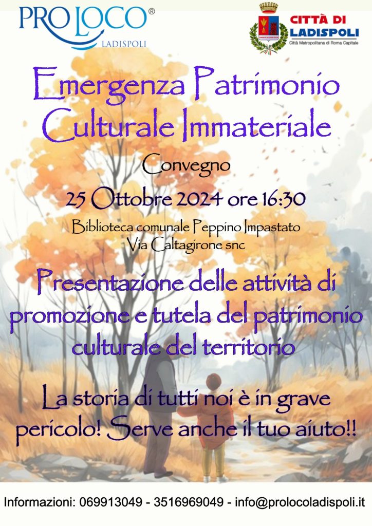La Pro Loco di Ladispoli, con il patrocinio degli assessorati Cultura e Turismo vi invita, il giorno 25 ottobre 2024 alle ore 16:30 presso la Biblioteca Comunale Peppino Impastato in via Caltagirone snc, a partecipare al convegno sul censimento del Patrimonio Culturale Immateriale.