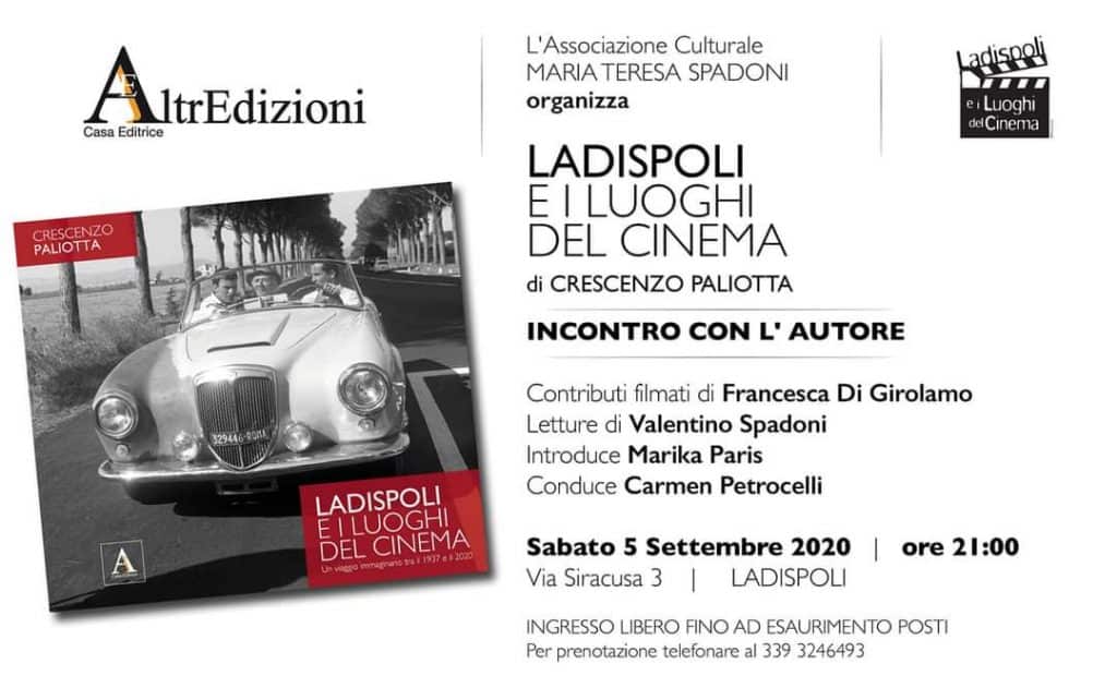 Ladispoli, sabato 5 settembre nuova presentazione del libro “Ladispoli e i luoghi del cinema” di Crescenzo Paliotta – Prosegue l’attività di promozione del libro “Ladispoli e i luoghi del cinema” redatto da Crescenzo Paliotta, medico e già Sindaco della città. Dopo la presentazione in Piazza Scarabellotto avvenuta lo scorso 11 luglio e il “firmacopie” presso la libreria “Scritti & Manoscritti” svoltosi il 28 agosto, infatti, sabato 5 settembre 2020, alle ore 21.00 è previsto un nuovo appuntamento dedicato alla conoscenza dell’Opera.