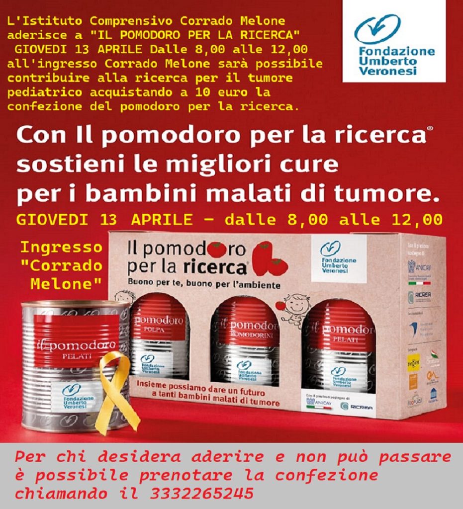 La Fondazione Umberto Veronesi, come ogni anno, propone “il pomodoro per la ricerca” per i tumori dei bambini. Quest’anno a Ladispoli saremo presenti presso la scuola Corrado Melone giovedi 13 Aprile dalle 8.00 alle 12.00. Ringraziamo i dirigenti Agresti e Pascucci che hanno accolto con entusiasmo l’iniziativa .