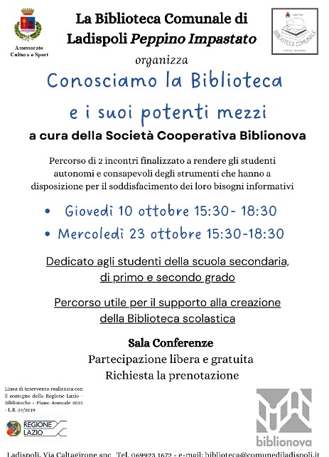 L’amministrazione comunale informa che presso la biblioteca di Ladispoli si svolgerà il laboratorio didattico “Conosciamo la biblioteca e i suoi potenti mezzi”, dedicato agli studenti della scuola secondaria, di primo e secondo grado, finalizzato a rendere gli studenti autonomi e consapevoli degli strumenti che hanno a disposizione per il soddisfacimento dei loro bisogni informativi. Focus del laboratorio sarà far conoscere la ricchezza del patrimonio documentario rappresentato all’interno del Polo della Regione Lazio, con particolare riguardo alla Biblioteca comunale di Ladispoli.
