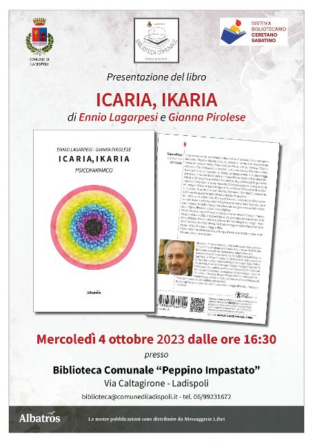 L’amministrazione comunale di Ladispoli informa che, presso la biblioteca di Ladispoli, mercoledì 4 ottobre alle ore 16.30, si svolgerà la presentazione del libro Icaria, Ikaria: psicofarmaco, di Ennio Lagarpesi e Gianna Pirolese. Il volume (in due tomi), pubblicato da Albatros nella collana Nuove voci, ha come protagonista un diplomatico in servizio in un disastrato paese del terzo mondo. Improvvisamente, seri eventi e decisioni non procrastinabili, innescano un thriller con i risvolti di un romanzo d’amore ai limiti del pericolo. L’opera, oltre a dare uno spaccato della vita diplomatica del protagonista nel suo percorso sentimentale, psicologico, filosofico, politico e religioso, ambisce a fornire risposte sul senso della vita, fatta di bilanci dai toni nostalgici e aspirazioni da concretizzare, fra riflessione e azione, fra monologhi e dialoghi ricorrenti, fra Oriente e Occidente, fra il senso tragico dell’esperienza umana e l’ilarità di situazioni buffe e personaggi risibili.