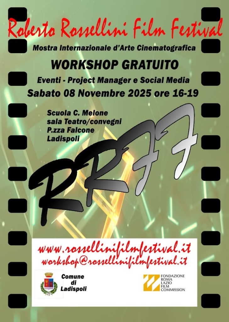Il Roberto Rossellini Film Festival entra nel vivo del suo percorso formativo con il secondo workshop, dedicato al tema “Organizzazione di Eventi”. L’iniziativa, promossa con il patrocinio del Comune di Ladispoli e dell’Assessorato alla Cultura, si terrà sabato 8 novembre 2025, dalle 16:00 alle 19:00, presso il Teatro della Scuola Corrado Melone.