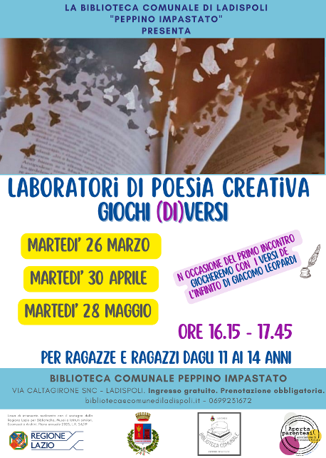 Dopo l’ascolto di una poesia illustrata ognuno procederà alla creazione di un nuovo componimento, proprio come in un laboratorio artigianale: ritagliandone parti e creandone di nuove, sulla spinta delle emozioni suscitate e delle idee elaborate. Il primo appuntamento si terrà martedì 26 marzo dalle 16.15 alle 17.45, e sarà dedicato ad uno dei maggiori poeti italiani: Giacomo Leopardi, con la sua poesia L’infinito. Il progetto è curato dall’Associazione Aperta Parentesi ed è realizzato con il sostegno della Regione Lazio per Biblioteche, Musei e Archivi – Piano annuale 2023, L.R. 24/2019. La partecipazione è libera e gratuita con prenotazione obbligatoria ai contatti della Biblioteca; sarà possibile partecipare ad uno o più laboratori.