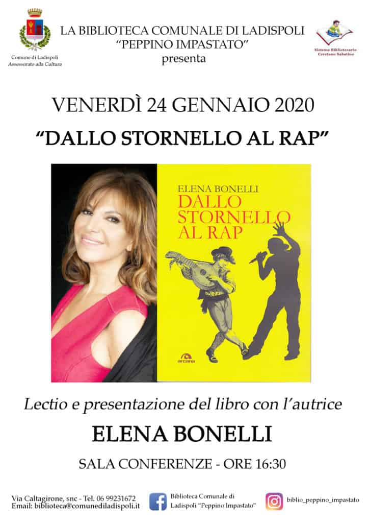 L’amministrazione comunale informa che venerdì 24 gennaio alle ore 16.30, presso la Biblioteca Comunale si terrà la presentazione del libro “Dallo Stornello al Rap” di Elena Bonelli, un viaggio appassionante nella storia della musica.