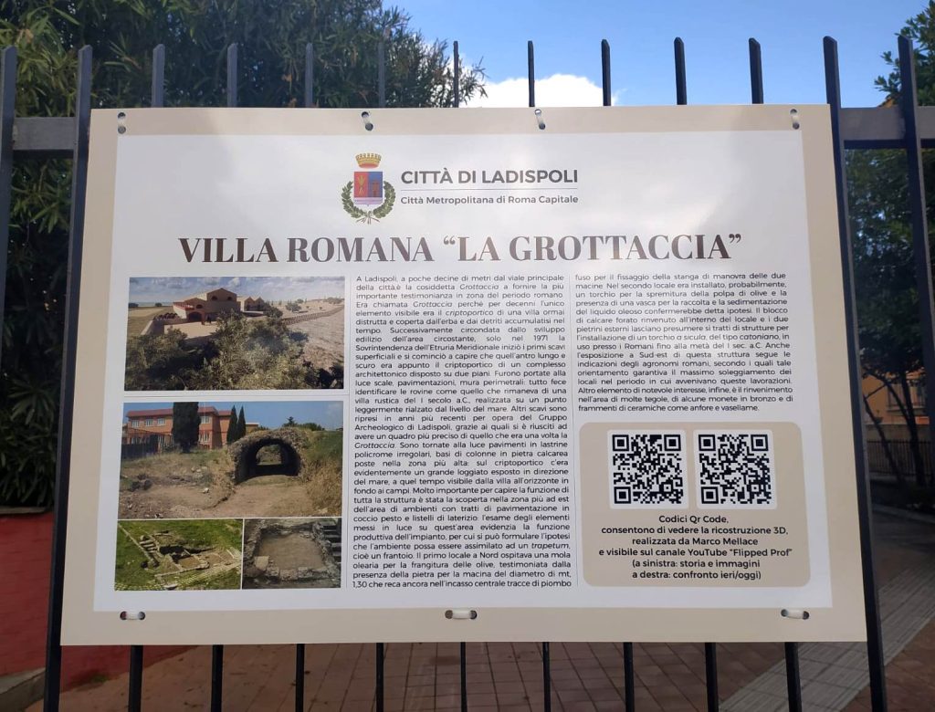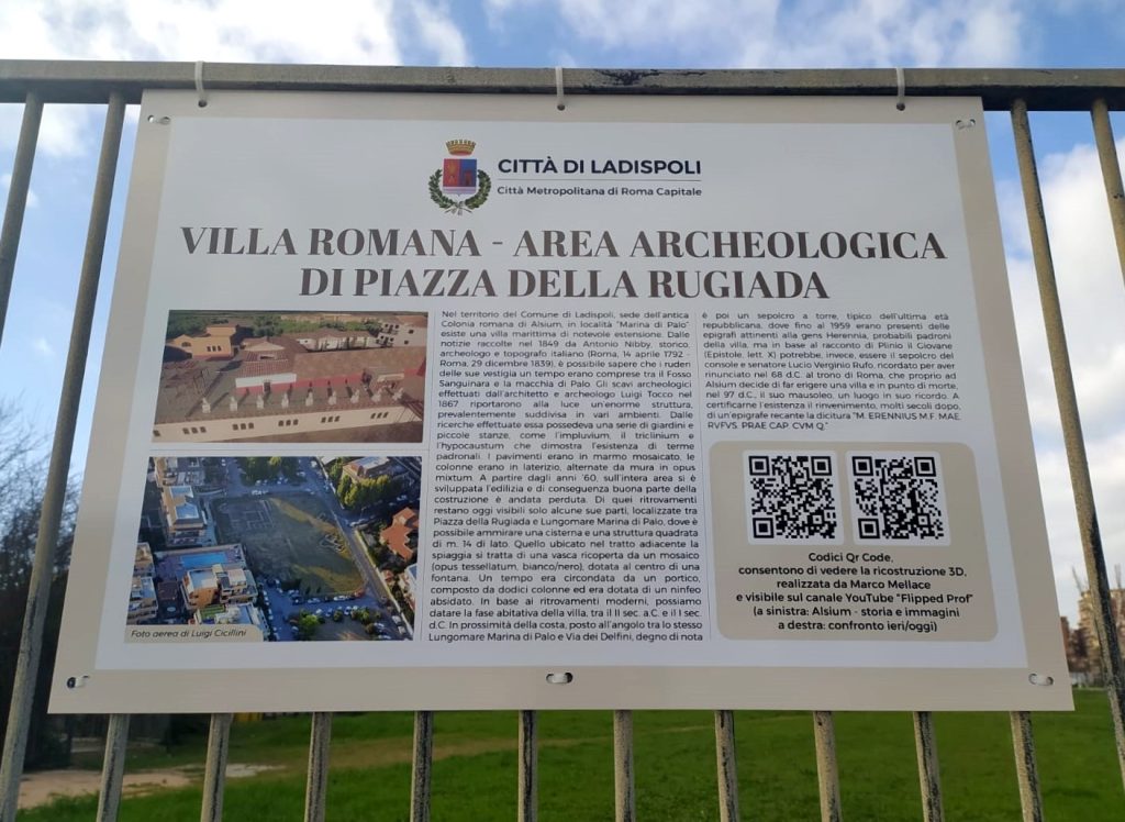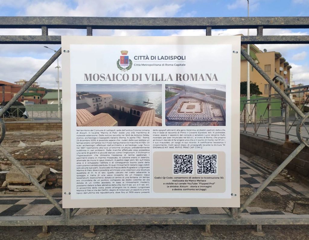 “I luoghi interessati dagli interventi – ha proseguito l’Assessore – sono quelli del centro urbano, come i ruderi della villa imperiale rurale della Grottaccia, di Via Rapallo e i resti della grande villa, sempre di epoca romana, posti tra Piazza della Rugiada, il mosaico di Lungomare Marina di Palo e il sepolcro, attribuito da alcuni storici al console e militare romano Lucio Verginio Rufo, ubicato nello stesso lungomare angolo con Via dei Delfini. La nuova cartellonistica contiene al suo interno immagine di confronto ieri (ricostruzione in 3D) e oggi, descrizione del luogo e Codici QR Code che rimandano alle relative ricostruzioni in tre dimensioni effettuate da Marco Mellace, visibili sul suo Canale YouTube “Flipped Prof”, che l’Amministrazione Comunale del Sindaco Alessandro Grando, partendo dalla sottoscritta, ringraziano per la disponibilità concessa, permettendo così all’iniziativa di poter aggiungere un’ulteriore servizio di conoscenza per la cittadinanza”.