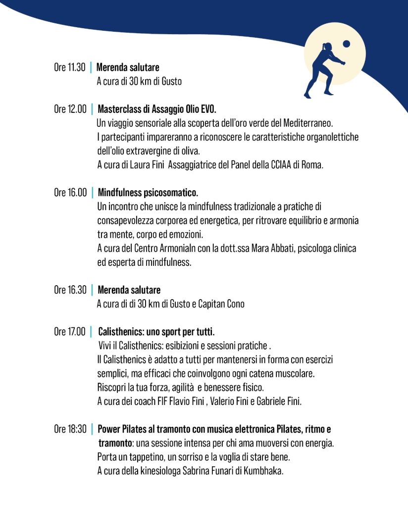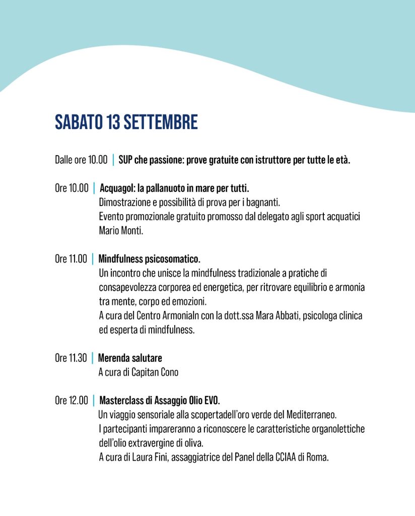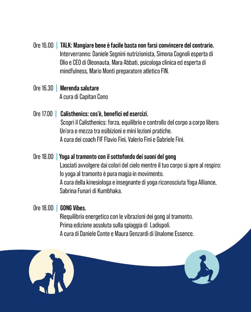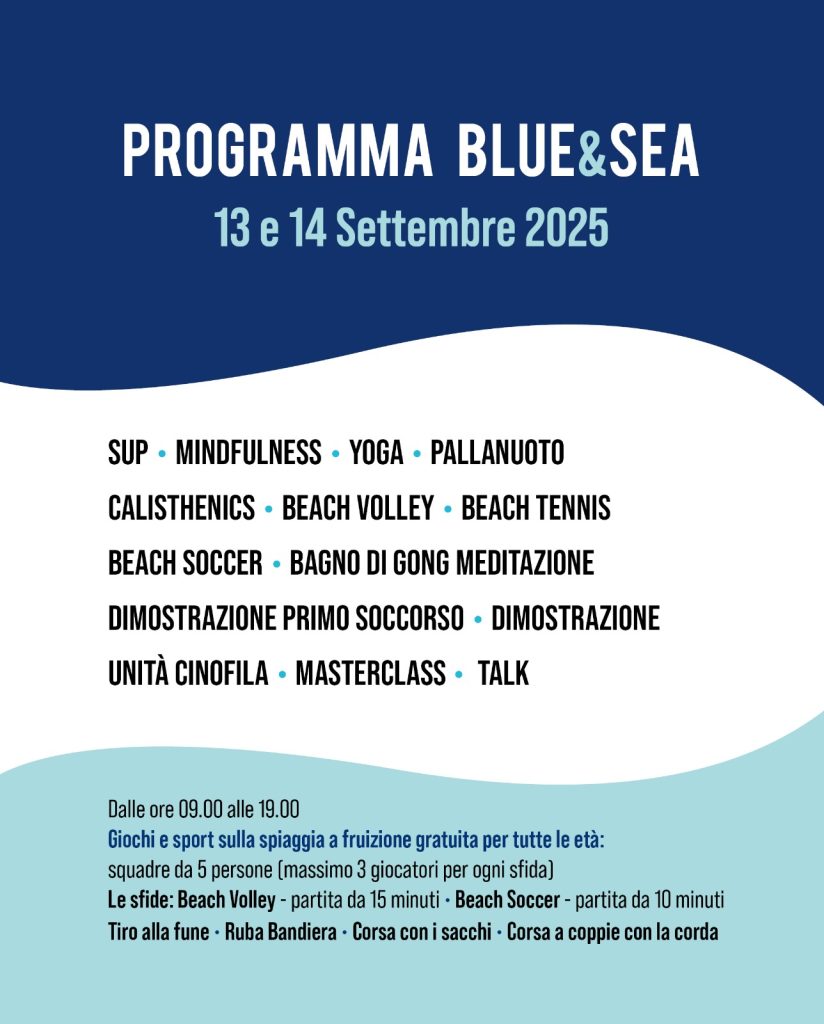Due giornate interamente dedicate al mare come fonte di benessere, salute e rigenerazione, pensate per superare l’idea del pianeta blu come semplice risorsa balneare e affermarlo, invece, come spazio di vita attiva, nutrizione sana e consapevole, equilibrio psicofisico e cultura sostenibile.