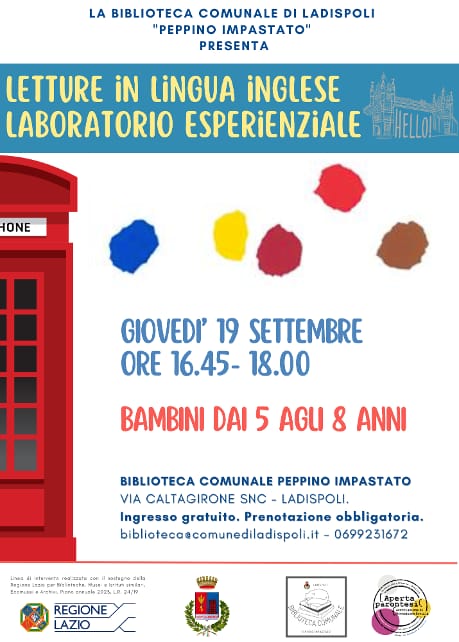 L’amministrazione comunale informa che giovedì 19 settembre presso la biblioteca di Ladispoli alle ore 16:45 si terrà il Laboratorio esperienziale con letture in lingua inglese, dedicato a tutti i curiosi dai 5 agli 8 anni.
