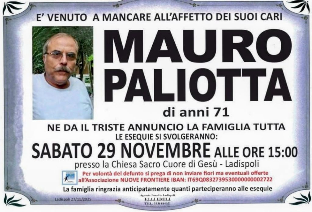 Le esequie avranno luogo sabato 29 novembre 2025, alle ore 15, presso la Chiesa Sacro Cuore di Gesù a Ladispoli.
