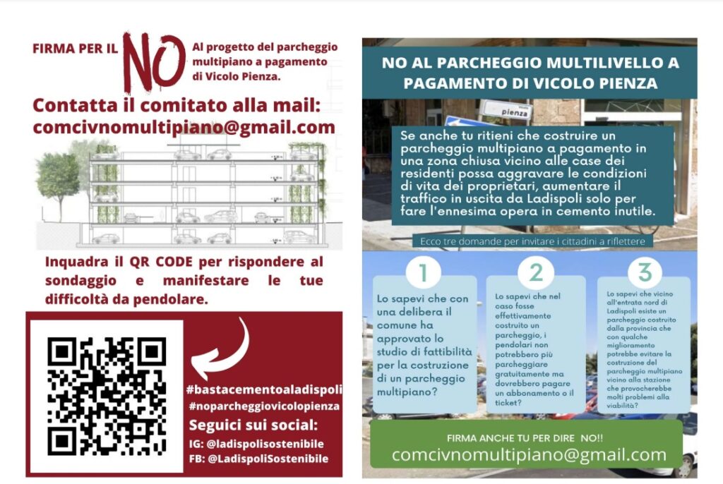 Da giorni diversi proprietari degli appartamenti siti in Via Taranto e Via Cagliari, riuniti in un Comitato civico e con il sostegno della pagina facebook LADSPOLI SOSTENBILE, dopo aver raccolto oltre 170 firme con la petizione NO AL PARCHEGGIO DI VICOLO PIENZA, hanno iniziato a distribuire il volantino (qui allegato) il cui scopo è solo quello di informare i cittadini nonché invitarli a riflettere circa l’idea di costruire il parcheggio multipiano in Vicolo Pienza angolo Via Taranto in prossimità della Stazione F.S di Ladispoli.