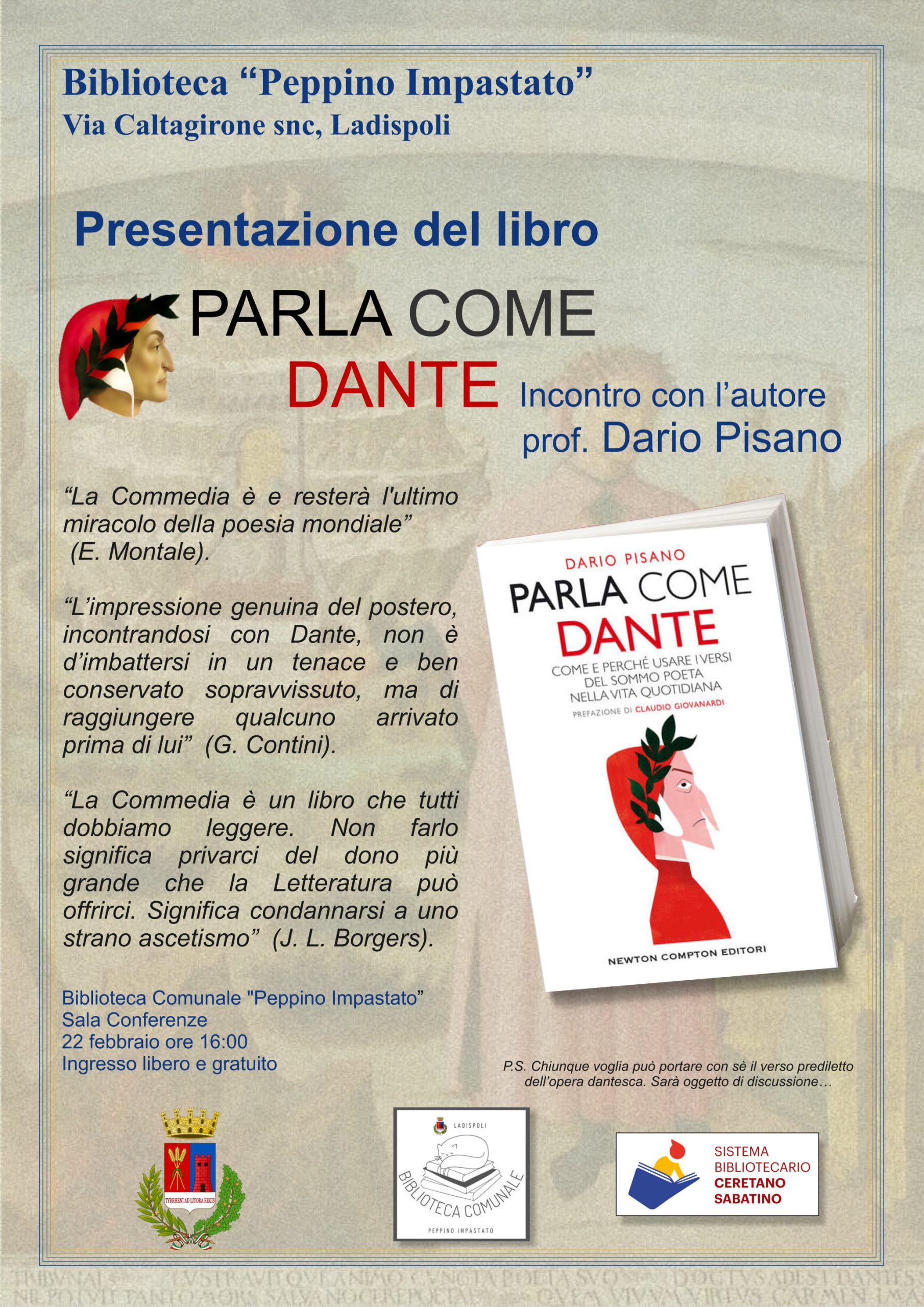 Giovedì 22 febbraio alle ore 16:00 la Biblioteca comunale di Ladispoli “Peppino Impastato” invita alla presentazione del libro dal titolo “Parla come Dante” di Dario Pisano.