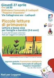 La Biblioteca comunale di Ladispoli “Peppino Impastato” inaugura un nuovo ciclo di letture di Nati Per Leggere con Piccole letture di primavera, letture a bassa voce per bambini da 0 a 6 anni a cura del Gruppo Volontari Nati per Leggere di Ladispoli, appena costituito e già pronto a collaborare con la Biblioteca e a diffondere la lettura su tutto il nostro territorio.