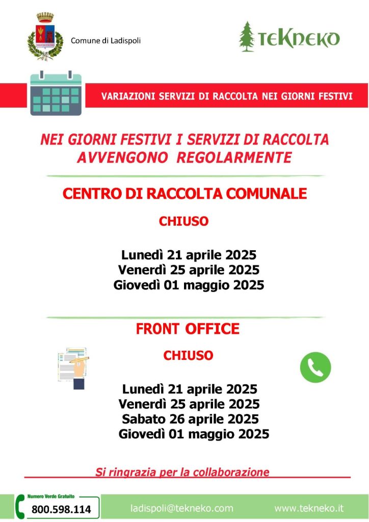 Si informa, invece, che il Centro di Raccolta Comunale resterà chiuso per l’intera giornata del 25 aprile.