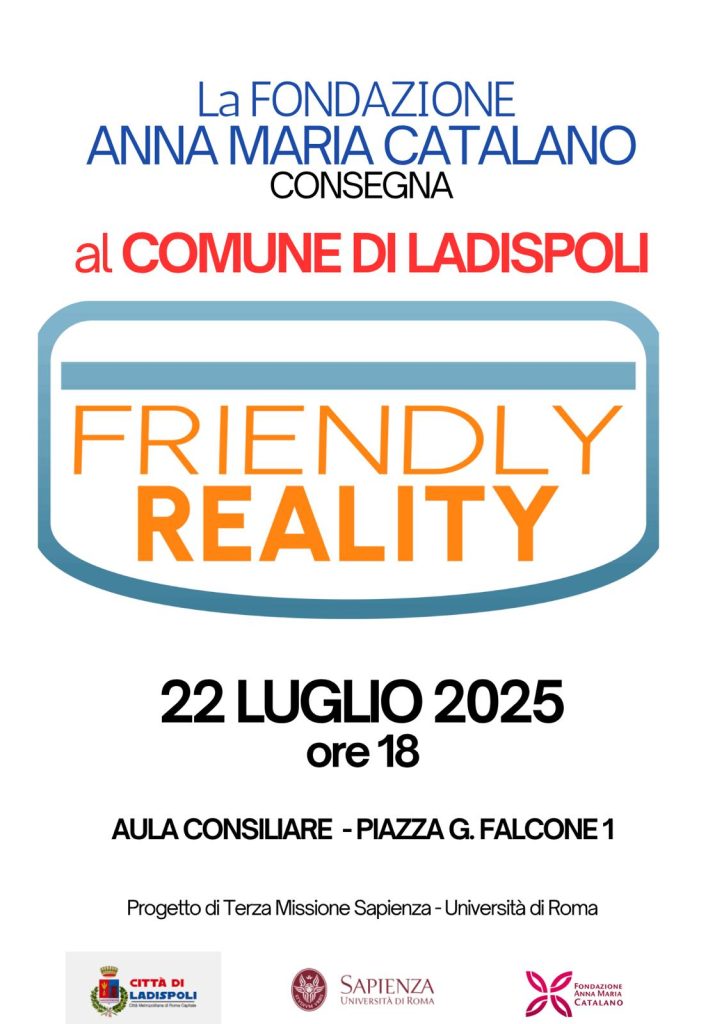 Martedì 22 luglio alle ore 18, il prof. Marco Raoul Marini dell’Università La Sapienza, consegnerà alla comunità di Ladispoli nella persona del primo cittadino, Alessandro Grando, l’innovativa soluzione denominata “Friendly Reality” realizzata nell’ambito della Terza Missione dell’Ateneo, anche grazie al sostegno della Fondazione Anna Maria Catalano.