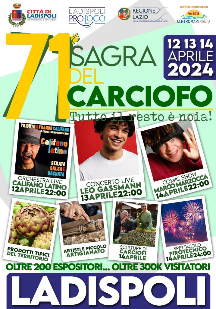Definito il palinsesto della 71° edizione della Sagra del Carciofo Romanesco di Ladispoli. Il 12, 13 e 14 aprile tutta la città sarà protagonista della festa più attesa dell’anno.