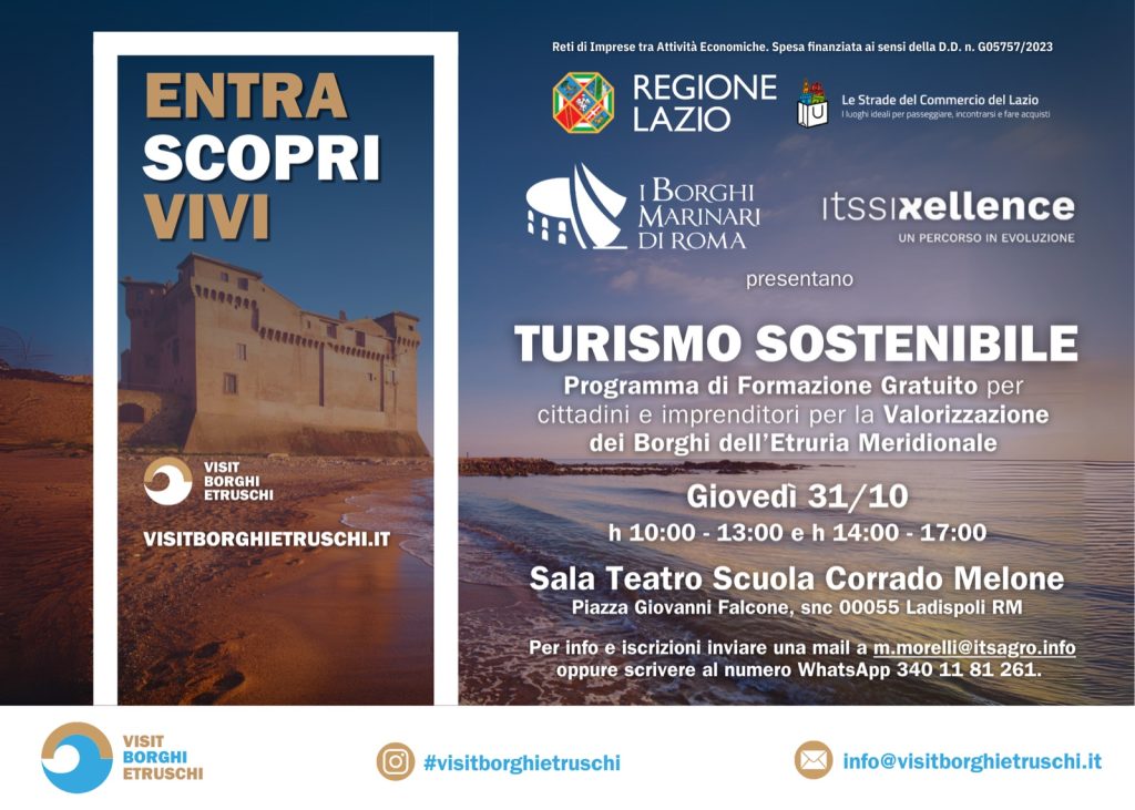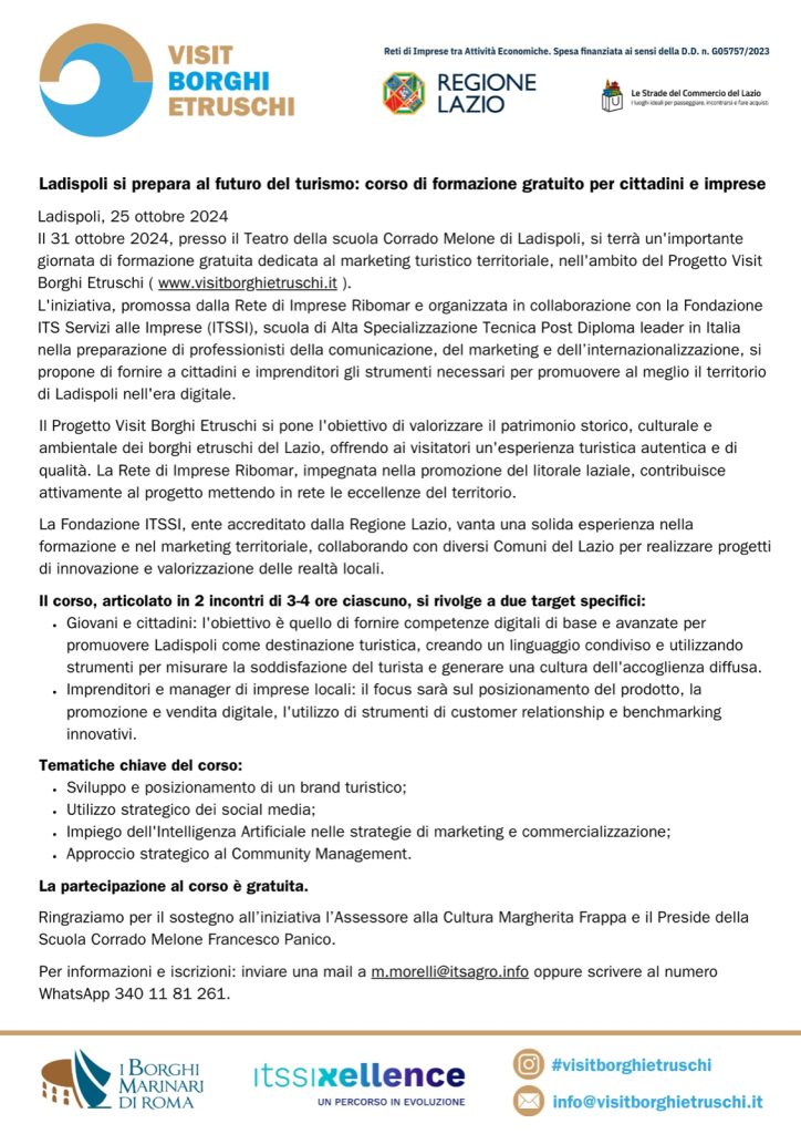 “Il 31 ottobre 2024, presso il Teatro della scuola Corrado Melone di Ladispoli, si terrà un’importante giornata di formazione gratuita dedicata al marketing turistico territoriale, nell’ambito del Progetto Visit Borghi Etruschi (www.visitborghietruschi.it).”