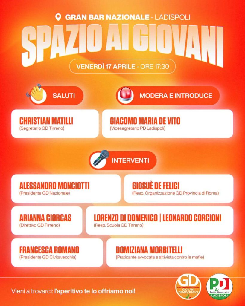 Ladispoli si prepara ad accogliere un momento di confronto dedicato alle nuove generazioni. Venerdì 17 aprile, alle ore 17:30, il Gran Bar Nazionale ospiterà “Spazio ai Giovani”, un’iniziativa promossa dai Giovani Democratici insieme al Partito Democratico di Ladispoli, con l’obiettivo di mettere al centro idee, esperienze e prospettive dei giovani del territorio.