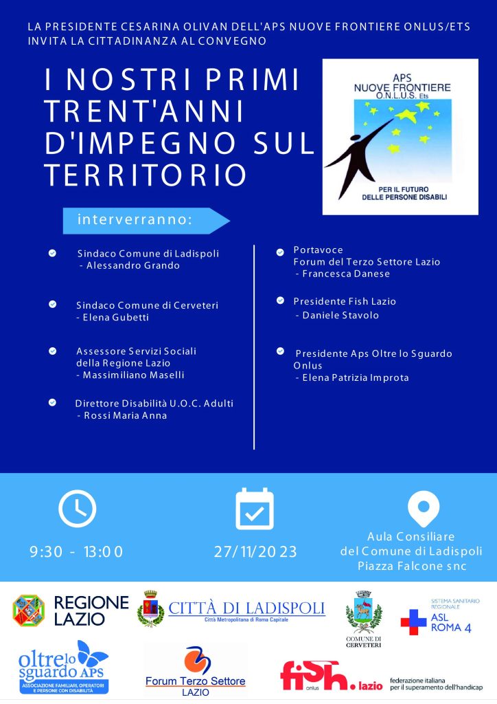 “I nostri primi trent’anni sul territorio”: questo il titolo del convegno organizzato dall’Aps Nuove Frontiere/Ets che si terrà il 27 novembre presso l’aula consiliare “Fausto Ceraolo”del Comune di Ladispoli dalle ore 9.30 alle ore 13:00. I lavori saranno aperti dalla presidente, Cesarina Olivan, a cui seguiranno gli interventi del sindaco di Ladispoli, Alessandro Grando, del sindaco di Cerveteri, Elena Gubetti, dell’Assessore ai Servizi Sociali della Regione Lazio, Massimiliano Maselli, del Direttore della U.O.C Asl Roma 4 di Civitavecchia per la Disabilità Adulti, Maria Anna Rossi, della Referente del Forum del Terzo Settore, Francesca Danese, del Presidente della Fish Lazio, Daniele Stavolo, e della Presidente dell’Aps Oltre lo Sguardo Onlus, Elena Patrizia Improta. Moderatore del convegno il Giornalista Fabio Bellucci di Centro Mare Radio.