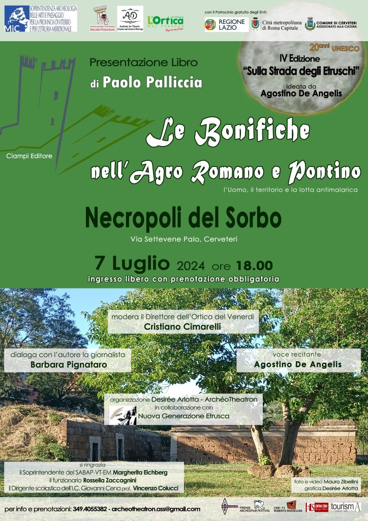 Domenica 7 luglio alle 18:00 un importante appuntamento culturale dedicato alla storia del territorio e delle bonifiche agrarie sarà presentato all’interno della Necropoli del Sorbo con la presentazione del libro del prof. Paolo Palliccia dal titolo “Le Bonifiche nell’Agro Romano e Pontino”, organizzato dall’Associazione Culturale ArchéoTheatron con il settimanale l’Ortica e la collaborazione dell’Associazione Nuova Generazione Etrusca che si occupa della manutenzione del sito, promosso dalla Soprintendenza Archeologia Belle Arti e Paesaggio per la Provincia di Viterbo e l’Etruria Meridionale. Un viaggio nella storia della bonifica del territorio laziale, ma soprattutto della storia d’Italia, dall’Unità d’Italia al 1945: un saggio dettagliato sulle bonifiche dell’Agro Romano e dell’Agro Pontino. Il saggio è un unicum tra le pubblicazioni sull’argomento, con uno sguardo sulla bonifica di Torrimpietra e della famiglia Albertini. Secondo l’autore la storia delle bonifiche merita un’attenzione ed una rilevanza maggiore: poiché negli anni dall’ 800 al 900 le bonifiche si intrecciano ed hanno molte connessioni con i grandi fatti storico-politici nazionali ed internazionali: anni in cui sui territori acquitrinosi incombeva la malaria che mieteva tante vittime, anche bambini. Erano gli anni del fascismo e delle grandi guerre, ma anche gli anni delle scoperte in campo medico-scientifico con cui i medici si sono impegnati a trovare cure per la malaria, avendo contatti anche con altri medici all’estero. Si parlerà anche del ruolo sociale dell’istruzione e delle scuole contadine create da Anna Fraenzel, moglie del medico Angelo Celli. Modererà la serata il Direttore dell’Ortica Cristiano Cimarelli, a dialogare con l’autore sarà la giornalista Barbara Pignataro e ad arricchire la storia attraverso momenti recitati sarà la voce di Agostino De Angelis.