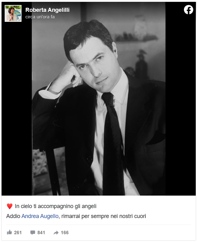 La moglie, Roberta Angelilli, ha comunicato la morte del marito sul proprio profilo Facebook: “In cielo ti accompagnino gli angeli. Addio Andrea Augello, rimarrai per sempre nei nostri cuori”.